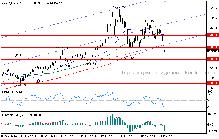Участники рынка все больше склоняются во мнении о том, что кризис суверенного долга в Европе оказывает гораздо более серьезное воздействие на экономику и финансовую систему региона, чем считалось ранее. Евросоюз, очевидно, переживает рецессию, в то время как некоторые его страны пытаются справиться с огромным долговым бременем. При этом не похоже, чтобы в ближайшее время Европа нашла какое-либо решение, способное убедить рынки в том, что кредитные риски не продолжат расти. Это заставляет многих инвесторов закрывать позиции в золоте из-за опасений, что проблемы Европы могут спровоцировать кризис ликвидности, подобный тому, что имел место в 2008 году. На текущий момент это является главной прочной падения котировок. Кроме этого, дополнительным фактором является укрепление доллара США, которое делает золото более дорогим и менее привлекательным для держателей других валют. И, наконец, падение котировок ниже технически важной отметки 1600.00 стало причиной закрытия многих длинных позиций в металле.