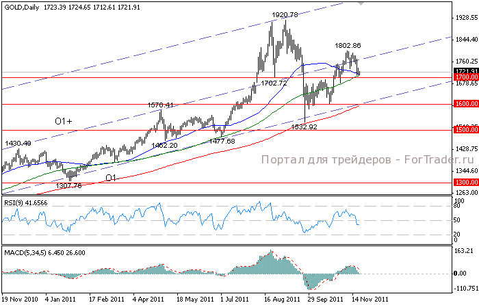 В пятницу наблюдалось небольшое улучшение настроений инвесторов на фоне снижения доходностей итальянских и испанских гособлигаций. Кроме того, появились надежды на то, что МВФ будет принимать более широкое участие в оказании помощи правительствам еврозоны. Это немного увеличило спрос на рискованные активы и оказало давление на доллар США, который торговался с понижением в течение дня. В свою очередь это позволило незначительно вырасти и котировкам золота. Однако к концу торгов доллар вернул утраченные позиции, а золото вернулось на уровни открытия. Понижательных рисков, связанных с долговым кризисом еврозоны, по-прежнему очень много. В их числе и опасения относительно нехватки ликвидности, что препятствует росту спроса на золото.
