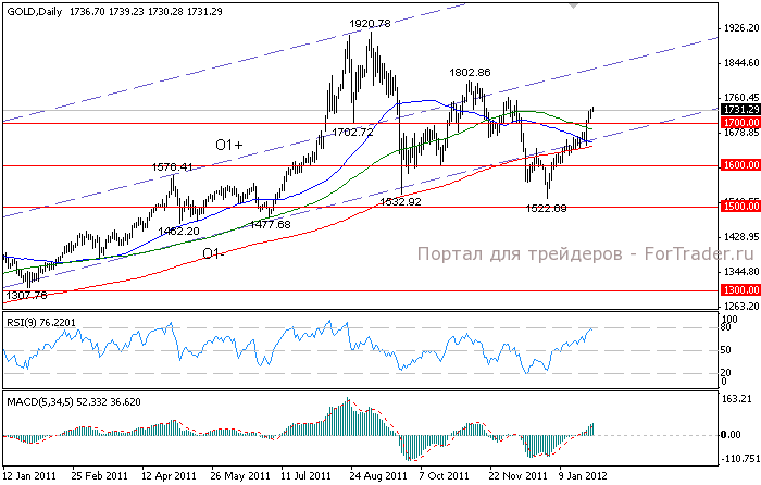 Позитивный импульс, который получило золото после оглашения итогов заседания ФРС, и который ускорил рост цен, сохранился в пятницу. Инвесторы продолжили покупки металла в качестве альтернативы валютам на фоне сохраняющихся опасений относительно долгового кризиса еврозоны. Представленные в пятницу данные по ВВП США в IV квартале также помогли котировкам вырасти, поскольку показатель не оправдал ожидания, свидетельствуя в пользу сохранения в США низких ставок. На этом фоне продолжилось ослабление доллара США, что является еще одним позитивным фактором для роста цен на золото, так как делает его более привлекательным для инвесторов, использующих отличные от доллара США валюты. В итоге котировки закрылись на недельном максимуме значительно выше отметки 1700.00 долларов за унцию.