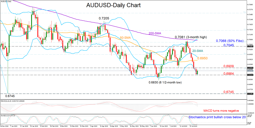 AUDUSD bears got exhausted near the key 0.6864 support level early on Wednesday, with the fast-Stochastics pointing to a price reversal as the green %K line has already crossed above the red %D line in the oversold territory and seem to be turning higher.