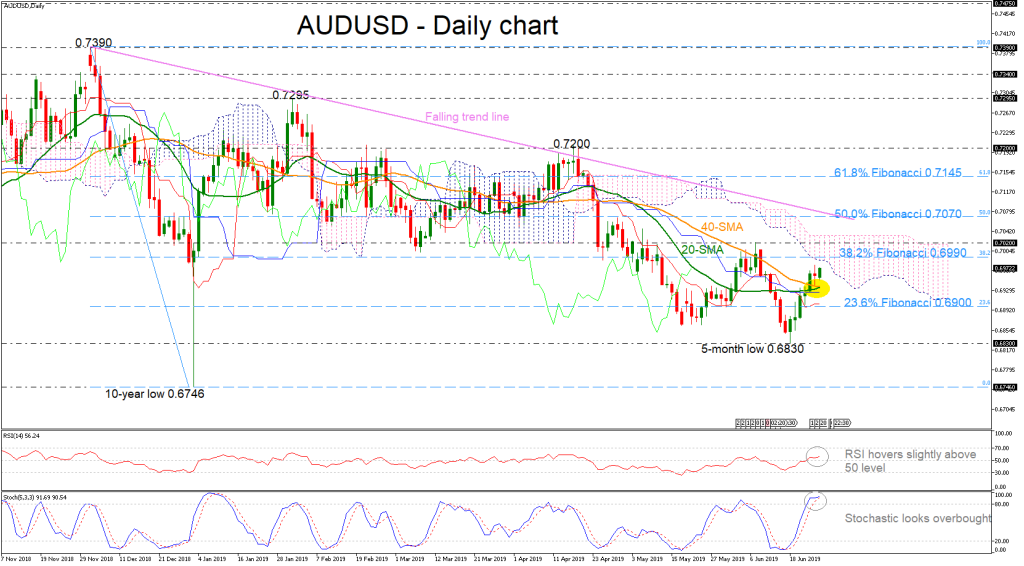 The pair needs to overcome the 38.2% Fibonacci retracement level of the downfall from 0.7390 to 0.6830 near 0.6990 to meet a key barrier around the 0.7020 resistance, taken from the latest high on June 7, near the upper surface of the Ichimoku cloud. The 50.0% Fibonacci mark of 0.7070 could act as resistance too as it overlaps with the falling trend line before a more important battle starts near the 61.8% Fibo of 0.7145.