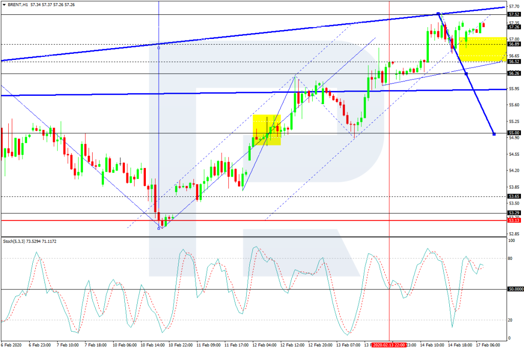 On Monday, February 17th. Brent is consolidating without any particular direction. The instrument is trading at 57.33 USD with the last week’s low being at 53.11 USD.