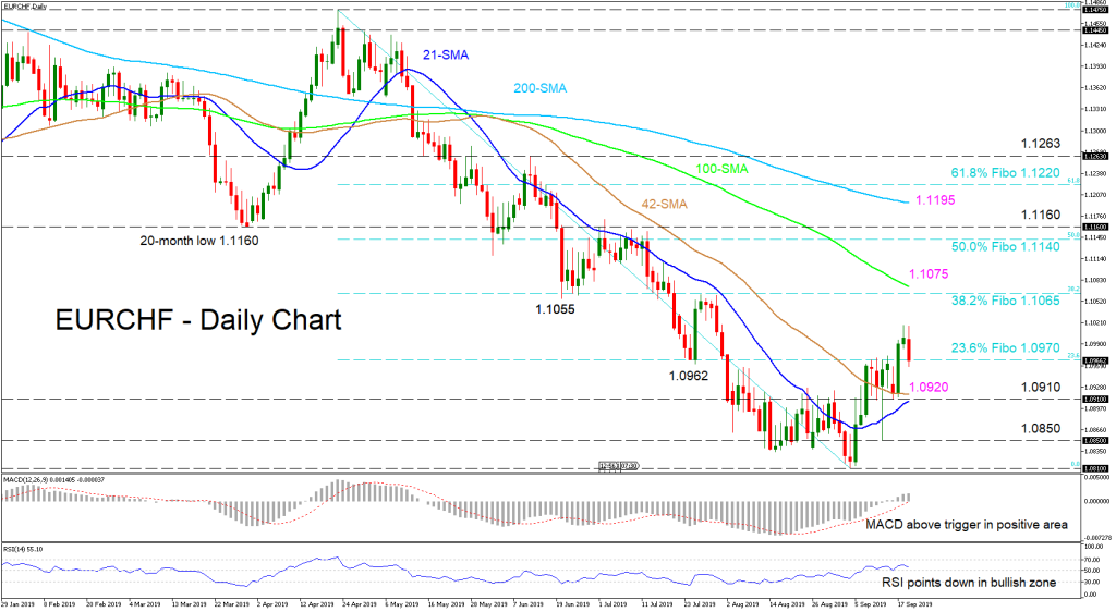 EURCHF bulls briefly overcame the formidable 1.0970 zone, which is the 23.6% Fibonacci retracement level of the down leg from 1.1475 to 1.0810, although the bears seized back control and are currently challenging that level. In recent weeks, the pair has been in recovery-mode, reclaiming some of the losses it posted during a nineteen-week decline that commenced on April 23.