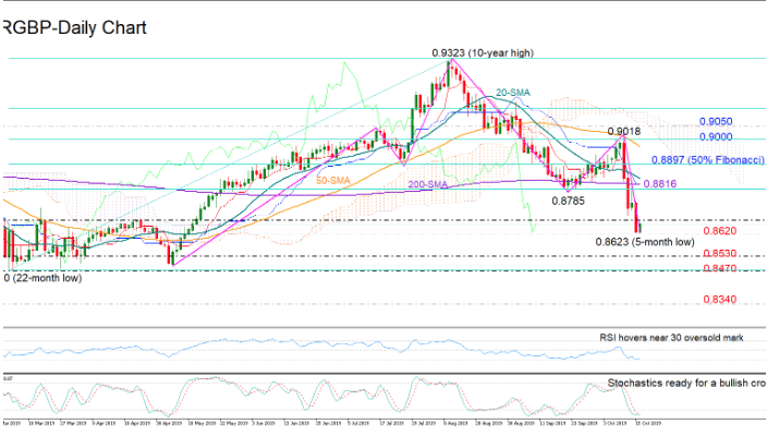 EURGBP’s rebound off 0.8785 proved fragile as sellers took full control below 0.9000, violently pushing the price towards a five-month low of 0.8623 early on Wednesday.