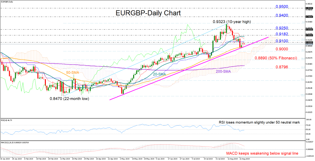 EURGBP remained below the 0.9100 level despite bouncing on the critical 3-month old ascending trend-line last week. With the RSI losing steam slightly under its 50 neutral mark and the MACD weakening below its red signal line, the short-term session is expected to appear neutral-to-bearish.