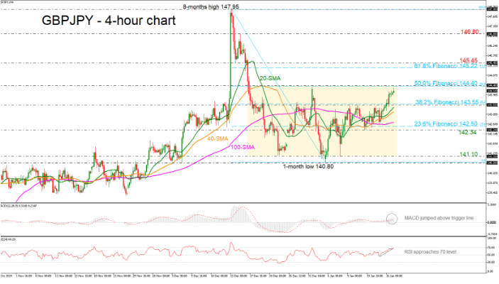 GBPJPY is trading sideways over the last month, struggling within the 50.0% Fibonacci retracement level of the downleg from 147.95 to 140.80 near 144.40 and the 141.10 support level. However, looking at the very short-term timeframe the pair rebounded on the 140.80 barrier on January 6 and surpassed the moving averages, suggesting an upward wave.