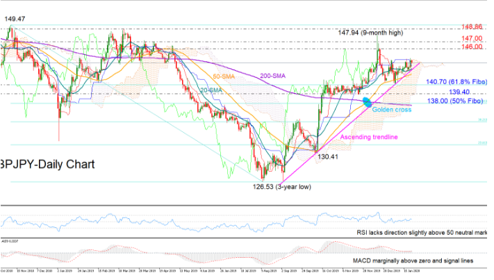 GBPJPY has been on the sidelines since mid-December but has been refusing to enter the Ichimoku cloud, with the RSI and the MACD suggesting that the indecisive mood may stretch into the short-term as both indicators appear muted near their neutral levels.