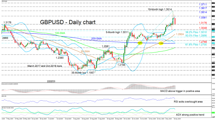GBPUSD’s positive momentum has eased somewhat, something also backed by the declining RSI, which has exited the overbought area resulting in a pullback off the recent nineteen-month high of 1.3514. However, the positive outlook remains intact assisted by the upward slopes in the mid-Bollinger band, 50- and 100-day simple moving averages (SMAs).