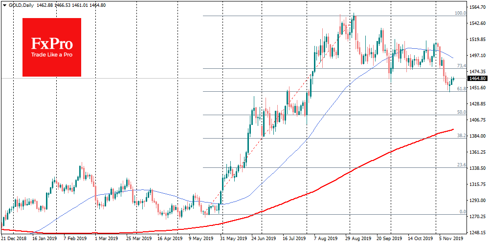 The influence of the dollar price on Gold should be questioned, as in the last two days, we have seen their simultaneous strengthening. Besides, the US and European stock markets have also been growing, albeit very cautiously. The simultaneous growth of these three assets is sporadic, and in this case, Gold has better chances to develop its growth. It seems that this precious metal corrected the increase during the May-September rally by its rollback to the 3-month low.