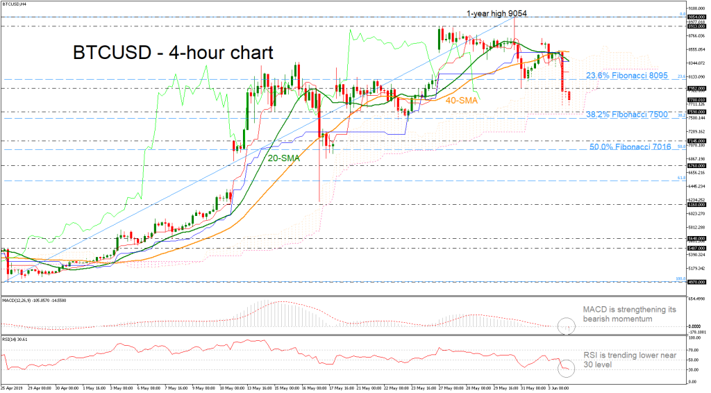 BTCUSD started the day sharply on the downside, moving closer to the bottom of the Ichimoku cloud and further below the 20- and 40-period simple moving averages (SMAs) in the 4-hour chart. The technical indicators are confirming the latest tweak as the MACD is strengthening its bearish momentum and the RSI is approaching the oversold zone.