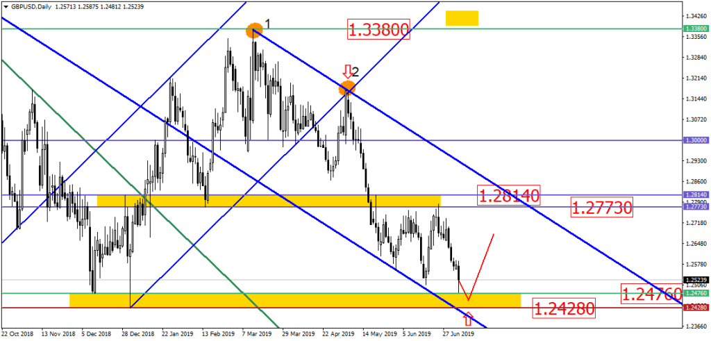 The British pound approached the support zone formed between the 1.2428 and 1.2476 levels, therefore it could potentially pull back from this zone: