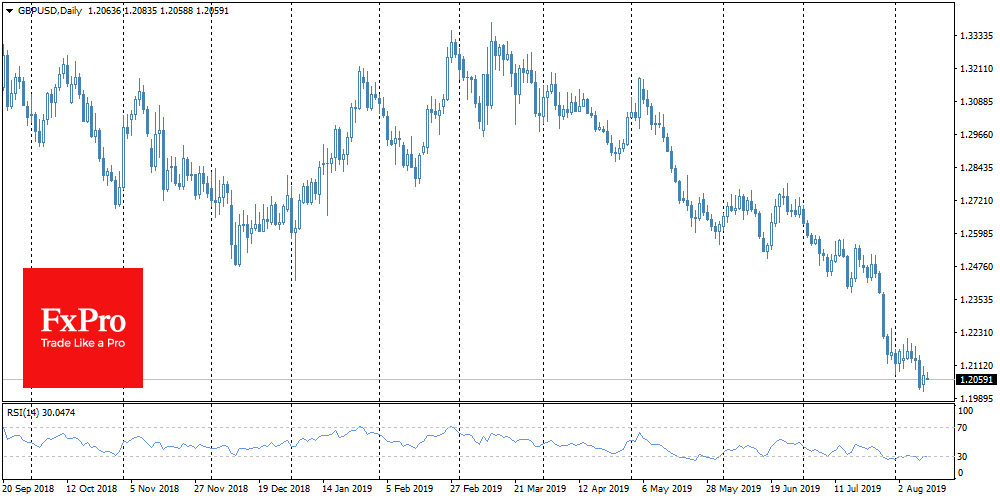 The British pound fell on Monday to 1.2015, one step from its low after Brexit at 1.1980. The British currency has lost 4% since the end of July, as statements from both Prime Minister Boris Johnson and some of his ministers increased concerns about a no-deal Brexit. The pound seems to be on to the brink and is capable of dropping below 1.20 in the event of any careless formulations by officials. But at the same time, on the technical analysis side, the British currency looks oversold, making it attractive to long-term investors who can quickly get involved in buying, on the realisation that the worst case is already priced in.