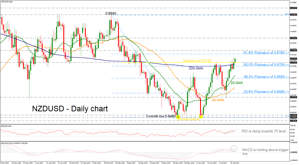 NZDUSD successfully surpassed the long-term 200-day simple moving average (SMA), gaining some ground and is holding near the three-month high of 0.6745 that it posted on Wednesday. The double bottom formation that was created around the 0.6480 – 0.6490 support levels with a neckline at the 0.6725 barrier, was completed with today’s break to the upside.