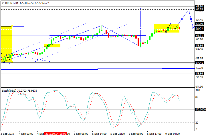 As we can see in the H1 chart, Brent has once again reached 62.40. Possibly, the pair may correct towards 61.50 and then start a new growth to reach 62.50. After breaking this level, the instrument may continue growing with the predicted target at 65.00. From the technical point of view, this scenario is confirmed by Stochastic Oscillator: its signal line is moving towards 50.00, thus implying a possible correction. After that, the indicator may continue rising towards 80.00.