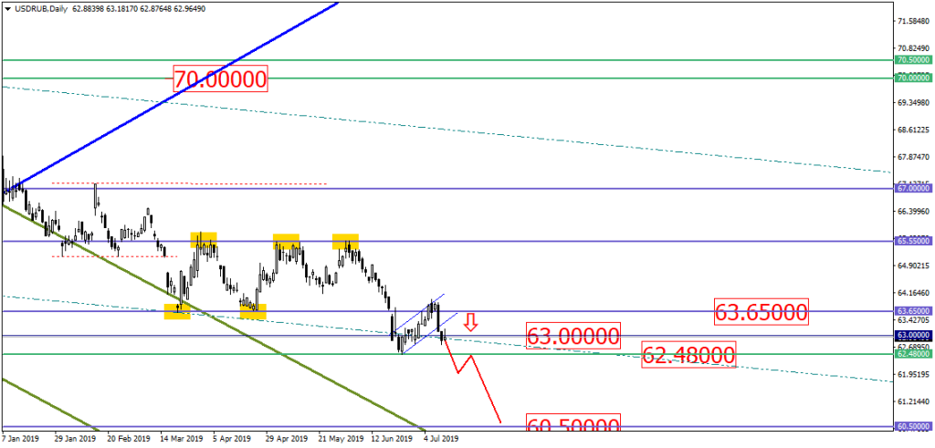 The USD/RUB went down, seemingly working through a reverse flag pattern. However, the asset is yet to break the 62.48 support level. Once it’s broken, the asset could drop significantly:
