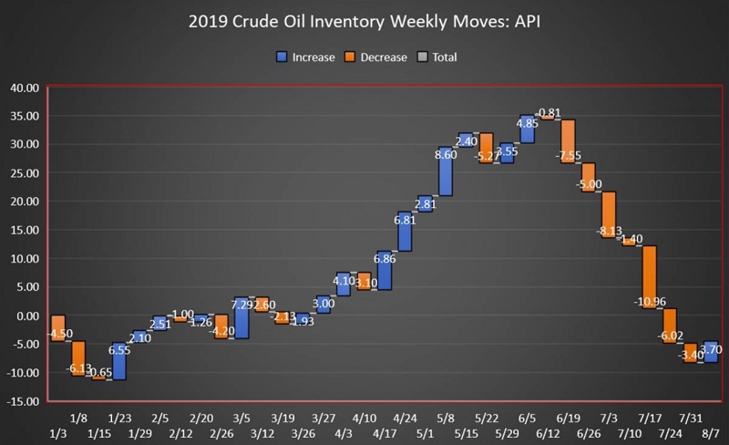 The American Petroleum Institute (API) has reported a crude oil inventory draw of 3.45 million barrels for the week ending Aug 15, compared to analyst expectations of a 1.889-million barrel draw. The inventory build this week compares to last week’s surprise build of 3.7 million barrels, according to API data. A day later, the EIA estimated that there was an inventory build of 1.6 million barrels.