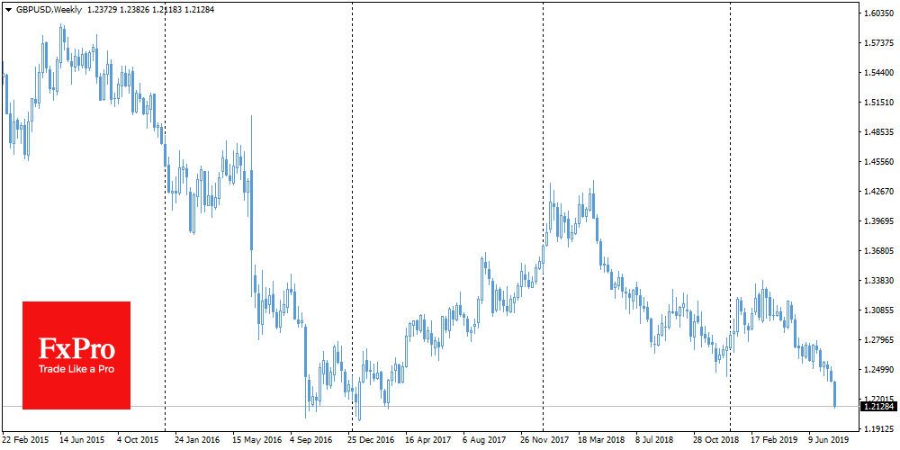 The British pound was sold out on growing fears of a potential ‘no deal’ Brexit. GBPUSD declined by 2% to 1.2130. Below these levels, the pair traded for only a few hours during the period from October 2016 to March 2017 because of the initial shock after the British referendum. The pound hasn’t been consistently lower since 1985. The new UK government notes that it considers the exit without a deal as the main scenario, as the EU does not want to discuss a number of conditions. The current situation around the British currency is highly volatile. As in the previous episode three years ago, extremely oversold conditions sharply increase the sensitivity of the pound to Brexit news. Purchases in the foreign exchange market at the background of relatively good news may be reinforced by the desire of participants to buy the pound at historically low levels. On the other hand, the decline is currently intensified by a massive triggering of stop-orders, which can be seen by the rather torn dynamics of GBPUSD during the Asian session, where there were several episodes of GBPUSD decline by 20 points per minute.
