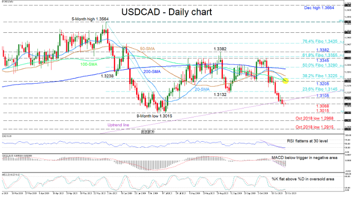 USDCAD came to a stop at the 1.3068 support coming from the swing low of February 1, after breaching the uptrend line drawn from 2017’s low. Sellers have kept the price below the trendline and therefore further declines are on the table, something also backed by the downward slopes of the 20-, 50- and 100-day simple moving averages (SMAs).