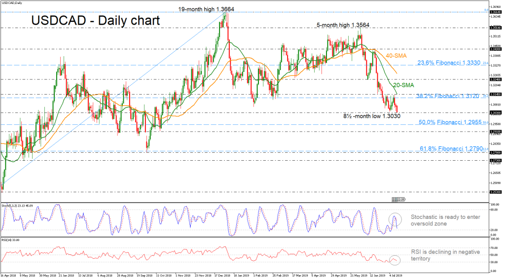 USDCAD is plunging today towards a fresh eight-and-a-half month low near 1.3030, following the pullback on the 1.3145 resistance level, which overlaps with the 20-day SMA.