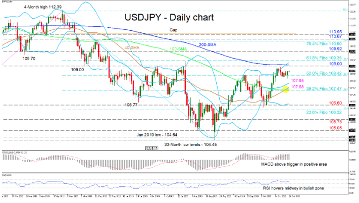 USDJPY has moved sideways along the recently breached 108.42 level, which is the 50.0% Fibonacci retracement of the down leg from 112.39 to 104.45. Bound between 109.00 and 108.42, the positive picture seems to be holding for now.