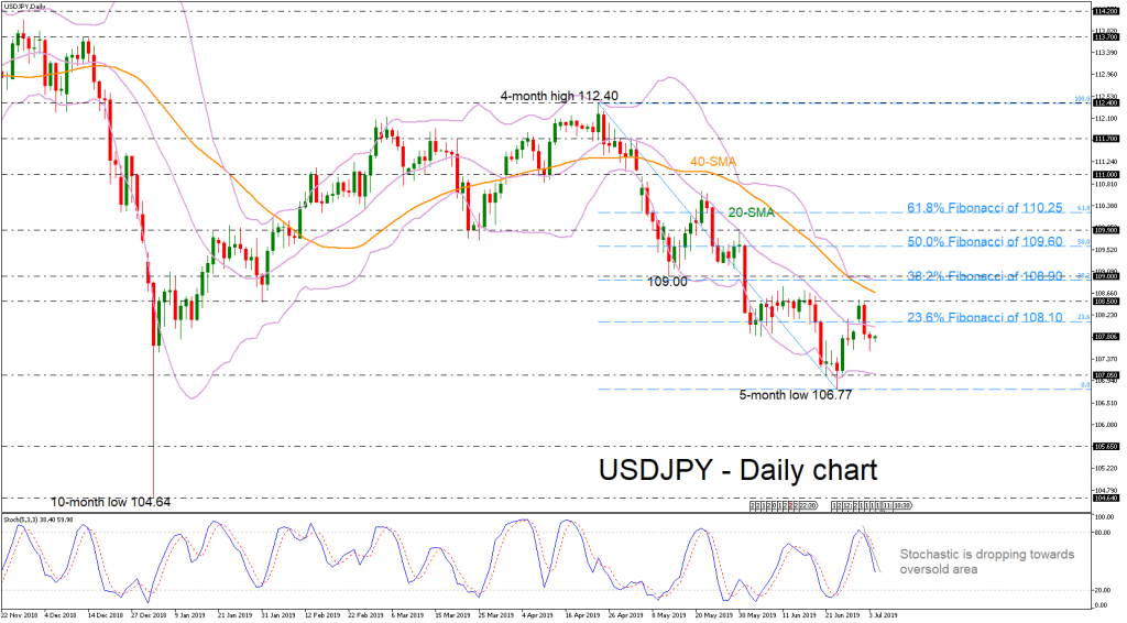 USDJPY held in losses over the previous couple of days, dropping back below the 23.6% Fibonacci retracement level of the downfall from 112.40 to 106.77 near 108.10 and the 20-day simple moving average (SMA). The negative bias in the near term is supported by the deterioration in the stochastic oscillator. The %K line of the stochastic is falling sharply towards oversold levels and posted a bearish crossover with the %D line.