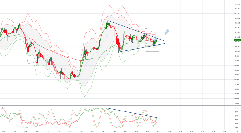 A full reversal of market sentiment from risk off in Q3 2019 to risk on in Q4 2019 spurred a strong recovery in USDJPY from three year lows of 104.4 in late August to witness prints above 109.50. Assuming that trade escalation risks stay low, together with global central banks leaning on their accommodative stance, it is likely the current bout of risk-taking hence JPY weakness can continue persist. Domestically, fiscal and monetary stimuli in 2020 are also clear negatives on the JPY. Taken together with the USDJPY pressuring a potential topside breach of its three year trendline resistance, I remain constructive on the USDJPY heading into the first quarter of 2020, if price can print a monthly close above 110.50 this would further encourage the bullish bias opening a move to test 114.50 and then onto 118.50 later in the year.