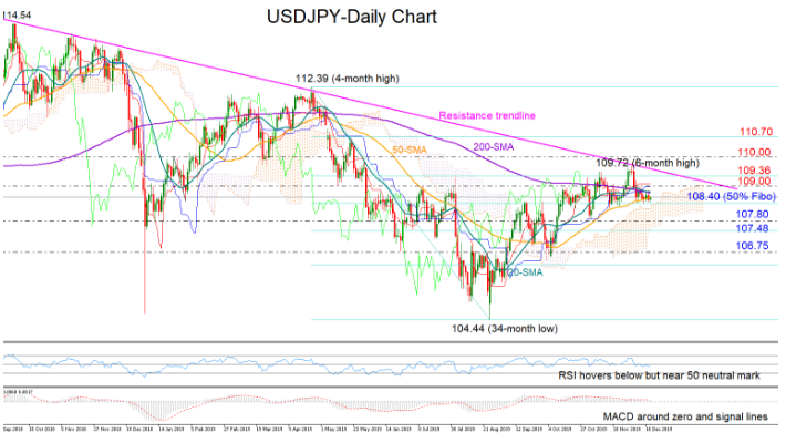 USDJPY could not reach the 110.00 level last week as the resistance trendline drawn from the October’s peaks blocked the bulls once again and pressed the price back down to the 50% Fibonacci of 108.40 of the upleg from 112.39 to 104.44.