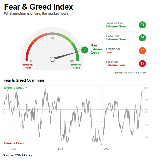 Global markets traded almost unchanged on Tuesday morning. US indices have managed to pull through the corrective moods, and futures for the S&P500 index have returned to historical highs. Asian indices traded almost flat. The volatility of the US stock markets has been declining for the last couple of weeks. This calm seen in the return of the VIX index to this year lows near 12 level. The Greed and Fear Index for US stock markets now stands at 89, level of “extreme greed”, contrasting brightly with the level of 18 just one year ago.