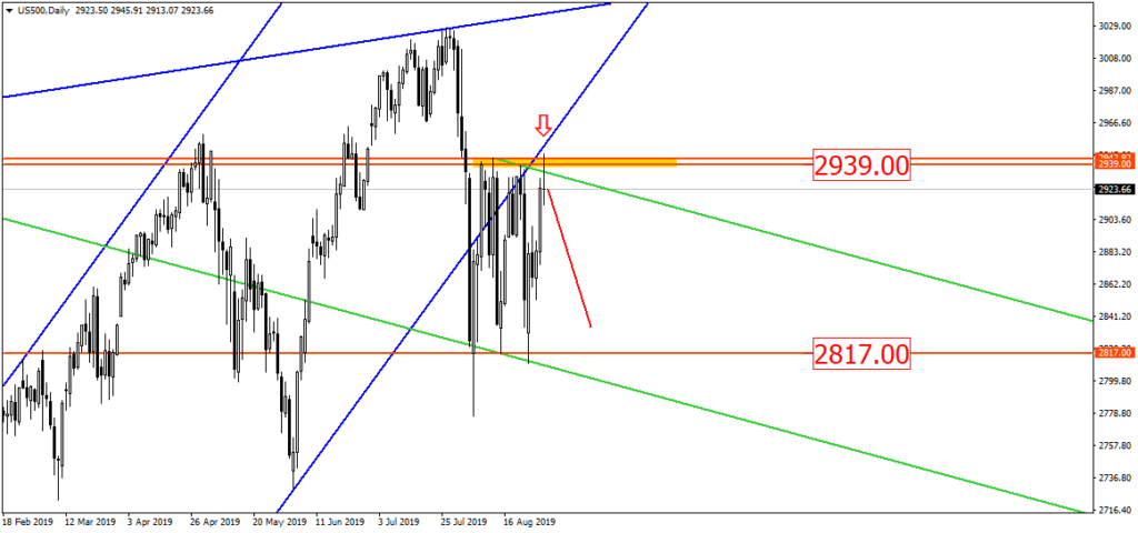 The American stock index, S&P500, has remained between the 2817.00 and 2939.00 levels. Recently the asset’s price has been next to the upper border of this range. At that point, the white candle and the bodiless candle with long shadows have formed the evening doji star. All in all, we could assume that the index could potentially drop to the 2817.00 level: