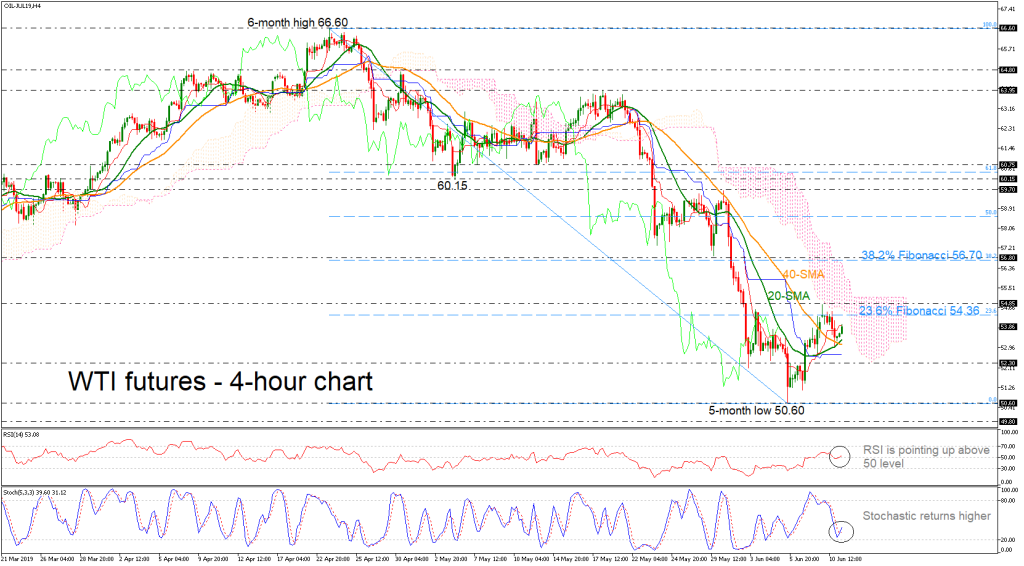WTI crude oil futures are rising above the bullish cross within the 20- and 40-simple moving averages (SMAs) but are still hovering below the Ichimoku cloud in the 4-hour chart. The downside momentum appears to have run out of steam as the stochastic oscillator is returning higher while the RSI is trying to gain ground above the neutral threshold of 50.