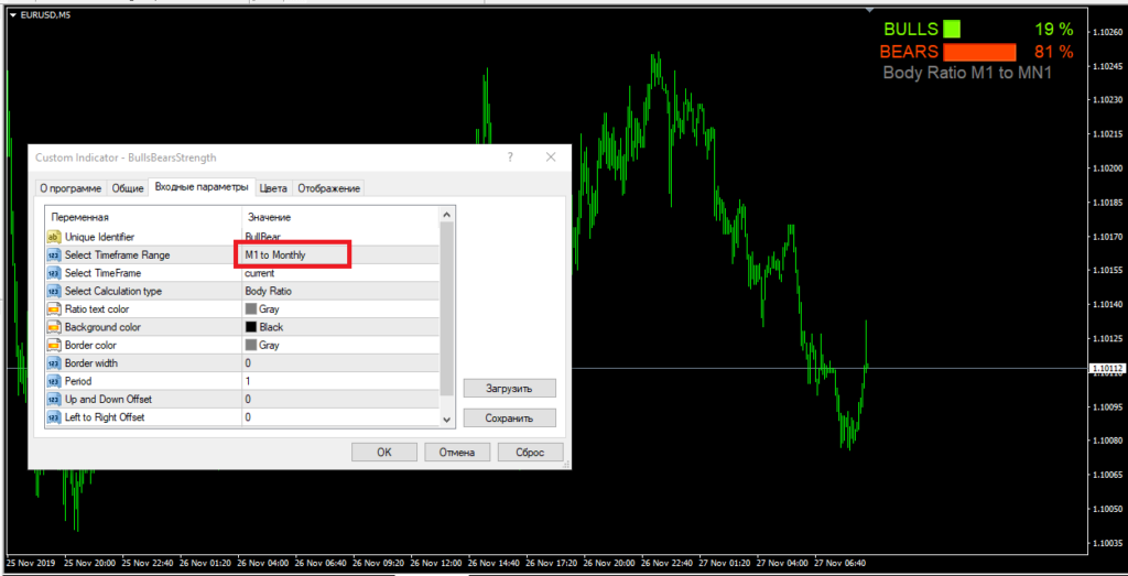 BullsBearsStrength is an indicator of the strength and the direction of a trend. In the separate window is displays the power of the bulls and the bears. With the same setting as on the picture below indicator will demonstrate long term trend. We recommend to search for signals of trend direction only if the trend power is 65% or more.