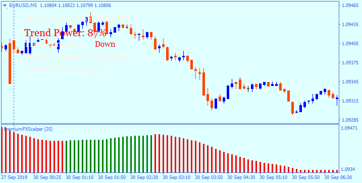 Indicator for scalping on binary options – that’s how the author has described it, although we assume it can be used for currency pairs on small timeframes. The indicator signals for enter the market when it changes the color, whereas trend power ratio must be higher than 65%.