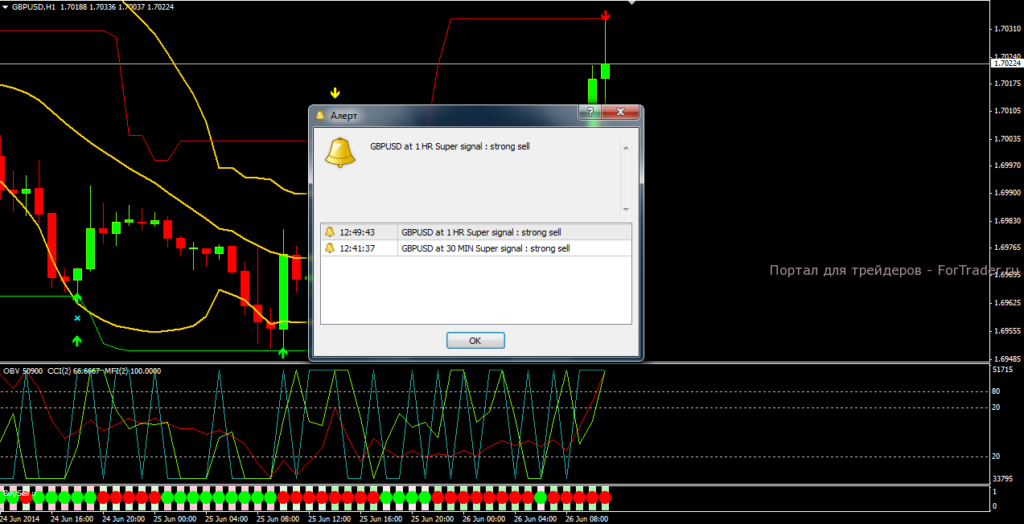 По наблюдениям экспертов журнала ForTraders.org, сделку, в рамках стратегии OBV System следует открывать по окончанию формирования предыдущей свечи. Для удобства трейдера в стратегии реализован вывод сигнального окна с описанием сигнала.