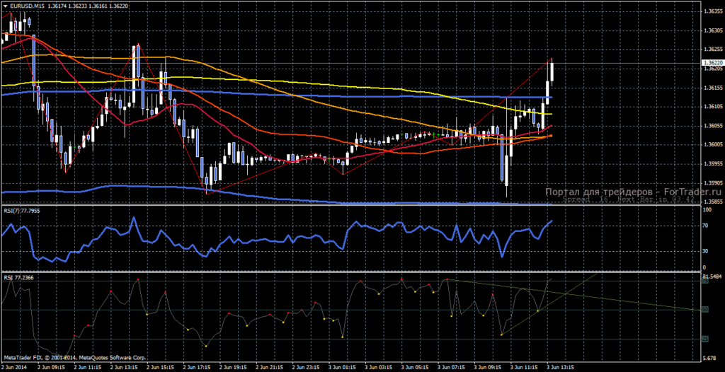 Входить можно как на М5, так и на М1. Входим по RSI, цель — ближайший сильный уровень (чаще всего — скопление скользящих средних). Стоп-лосс и тейк-профит отсутствуют, закрываем сделки вручную при достижении целей.
