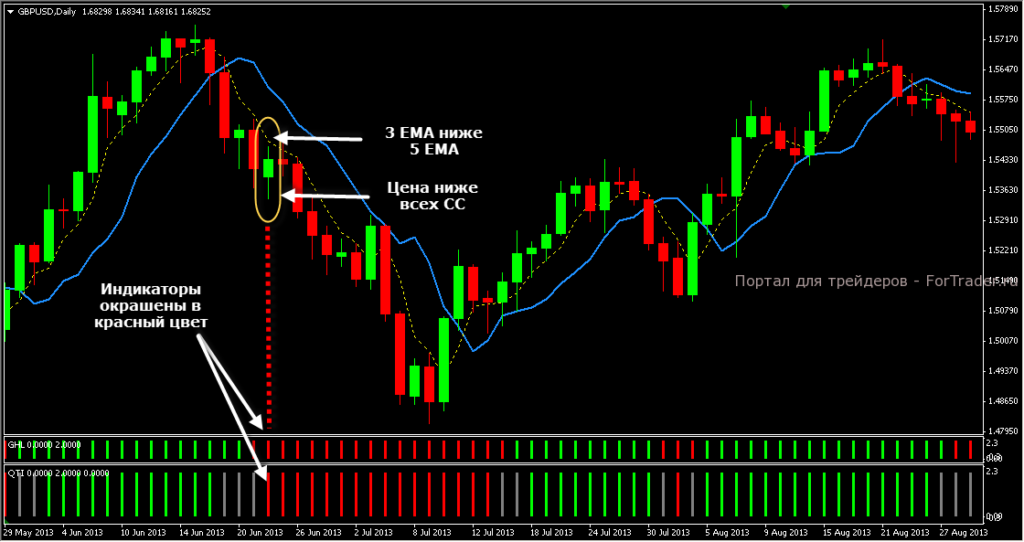 - Скользящая средняя 3 EMA будет ниже СС 5 EMA.