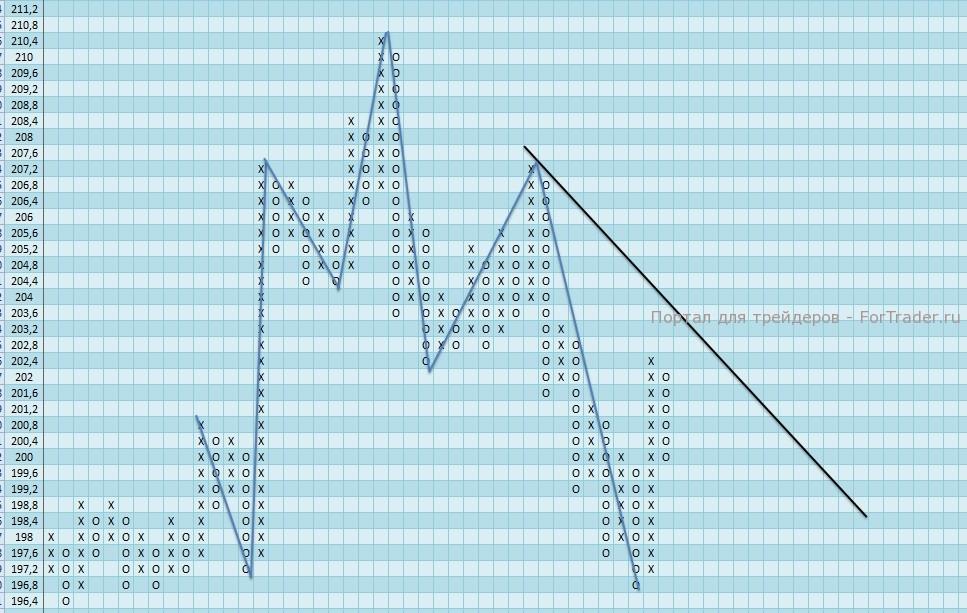 Уровнем сопротивления выступает отметка 203,6, где проходит основная линия нисходящего тренда в случае преодоления которой основная тенденция сменится на восходящую и поступит сильный сигнал к покупке.