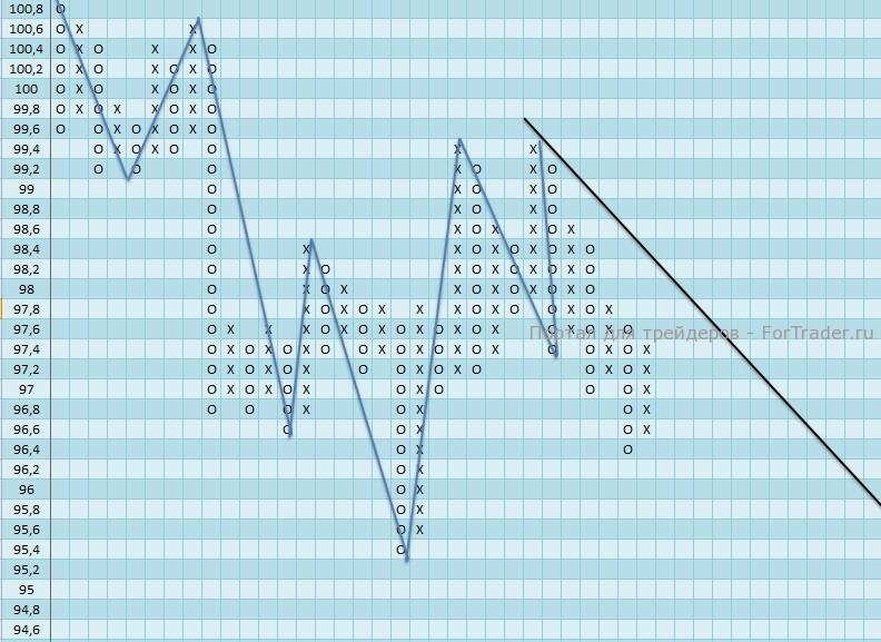 Сейчас основной целью для покупателей выступает уровень сопротивления 97,8 преодоление которого подаст слабый сигнал к покупке против направления основной тенденции и откроется путь к отметке 98,4 где проходит основная линия нисходящего тренда.