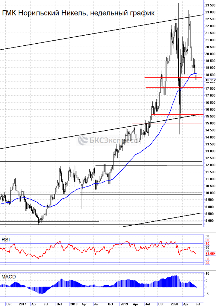 Несмотря на внушительное снижение, трендовые индикаторы на длинных таймфреймах продолжают оставаться на стороне покупателей, а сигналов о смене глобальной растущей тенденции пока не появились. Сильная зона торможения расположена на 17 600–18 350 руб. Эта область уже была полностью протестирована, и сейчас цена находится в ее пределах. Закрепляться ниже нее бумагам не рекомендуется, так как в таком случае цели могут сместиться к 16 500 руб.