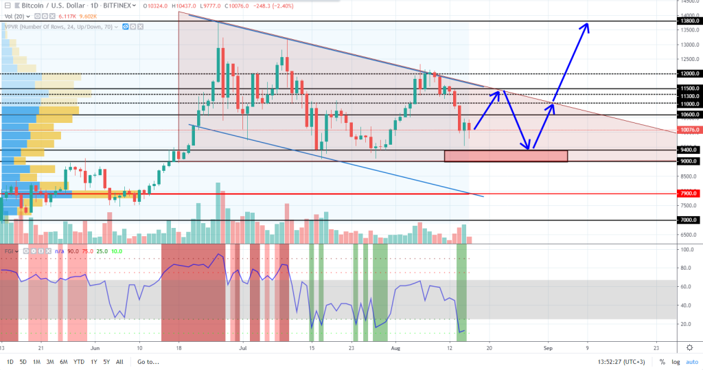 В случае успеха это будет 3-я защита за месяц, а акцент среднесрочного движения будет окончательно смещён с ценового канала в сторону сходящегося треугольника. Тем не менее, в случае пробития зоны следующая сильная поддержка будет в районе $8000, на что указывают объёмы. Достаточно часто цена возвращается в область больших объёмов, предоставляя отличную точку входа в лонг, поэтому такой вариант не стоит исключать.