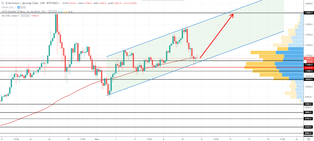 Про важность уровня $11500 мы говорили в предыдущем обзоре. В зоне же $11400-11500 сосредоточен основной объём и локальный интерес участников рынка согласно индикатору «профиль объёмов». Дополнительным подтверждающим фактором можно считать касание MA100, которая выступает в роли динамической поддержки с начала текущего месяца.