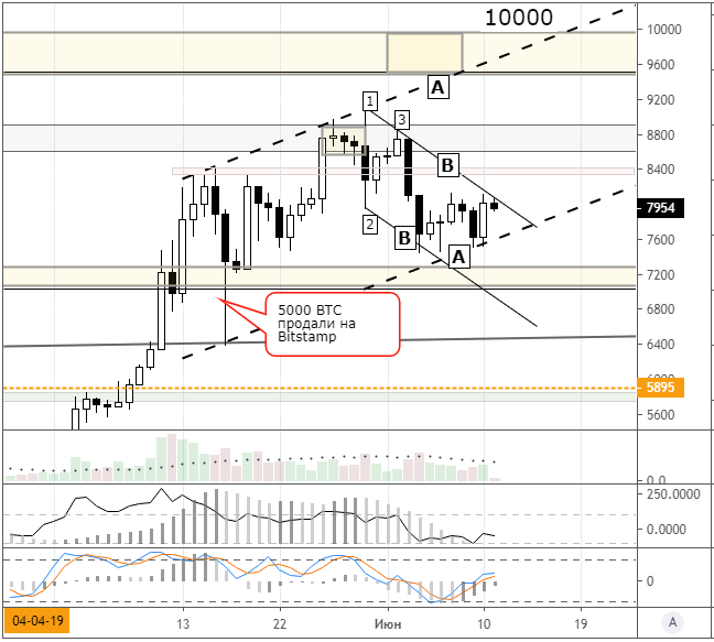 Рынок достаточно отдохнул, но мы считаем, покупатели задержались на текущем уровне. Время начинает уже работать против них. Чтобы продлить «бычий» тренд, им нужно как можно быстрее вытолкнуть цену вверх из канала «B-B» и закрепиться выше $8170. Повышение цены до $8600 вернет на рынок покупателей, которых вынесло 30 мая, 3 и 4 июня.