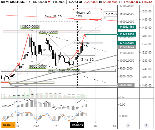 После вечерней борьбы рынок сейчас опять находится в коррекционной фазе. Из 12 свечей пока только две «медвежьи». Если сравнивать последний рост с ралли с 10 июня, то 12 дней — это не предел. У покупателей есть время в запасе, но стоит насторожиться. Если сегодня или, в крайнем случае, завтра до 12 UTC, покупатели не смогут пройти $12 350, то на рынке может начаться продолжительная фаза снижения до 10 сентября (по циклам). Падение биткоина может быть резким, если защитные активы тоже начнут коррекционное движение. В сентябре нас ожидают новые торговые переговоры США с Китаем.