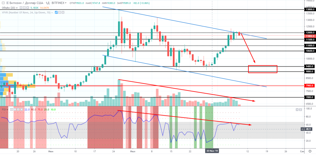 С конца июля биткоин вырос на 25% и подошёл к верхней границе ценового канала, в котором торгуется последние несколько месяцев. Быки преодолели область $10600-11500, а вот уровень $12000 оказался неприступен. И, скорее всего, пробития и не произойдет. Локальный тренд, который поднял котировки с $9400 до $12000, торговался без особого увеличения объёма. Сил у покупателей пока явно не хватает, чтобы переломить среднесрочную тенденцию.