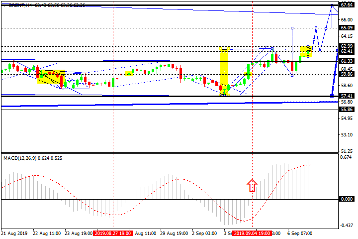 Технически такой сценарий подтверждает осциллятор MACD. Его сигнальная линия торгуется в зоне гистограмм на продолжение тренда. Это предполагает дальнейший рост цены к уровню 65.00.