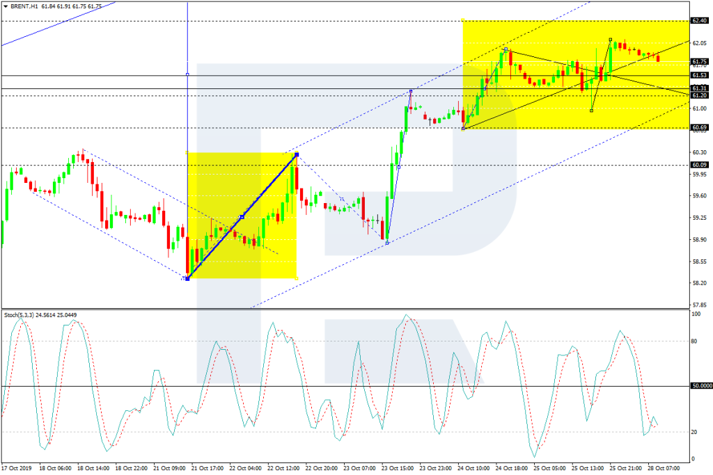 На 4-часовом графике Brent отработана очередная структура роста к уровню 61,30. Она рассматривается как составная часть третьей волны восходящего тренда, и это только половина данной волны. Ожидается расширение диапазона до 62,40. Затем — снижение к уровню 61,30. В случае пробоя 62,40 вверх откроется потенциал роста к уровню 64,50 — расчетной цели для третьей волны роста по тренду.