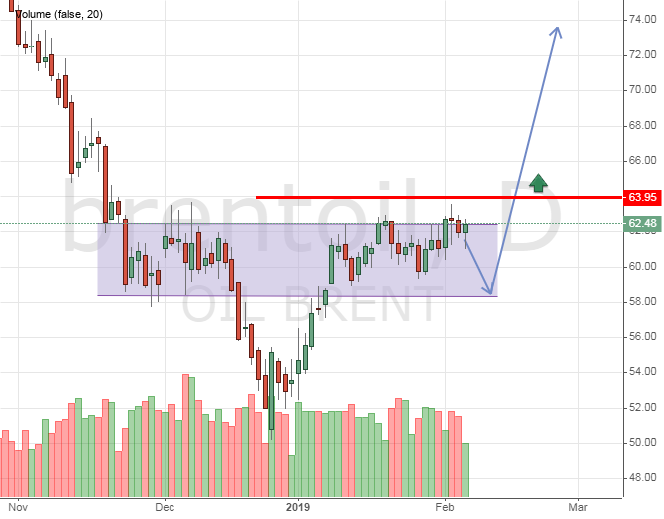 Цена на нефть Brent обновила максимум с начала года, но, в очередной раз, так и не смогла закрепиться выше уровня 63 долл/баррель. С технической точки зрения, уровень 63 является «линией шеи» фигуры разворота тренда «Перевернутая голова и плечи».