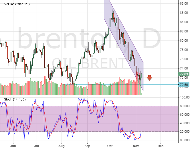 Медведи по нефти взяли паузу на отметке 72,50 долл/баррель, однако, подавленный настрой на рынке сохраняется и продажи могут возобновиться в любой момент. 5 ноября в силу вступают санкции США против Ирана, которые могут серьезно ограничить экспорт нефти из страны. Наряду с этим, большинство стран-производителей наращивают объемы добычи до рекордных отметок, чтобы покрыть освободившийся спрос.