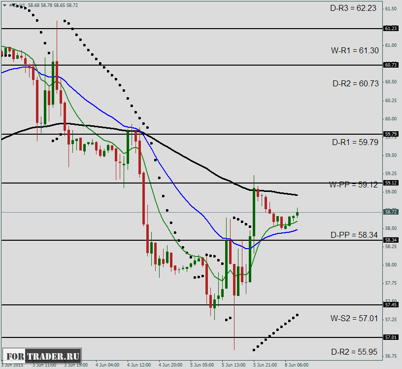 В такой рыночной ситуации стоит учитывать, что на данный момент цена находится над уровнем РР, рынок снимает перепроданность, расчетное движение вверх ограничено уровнем W-PP-59,12 (см. график).