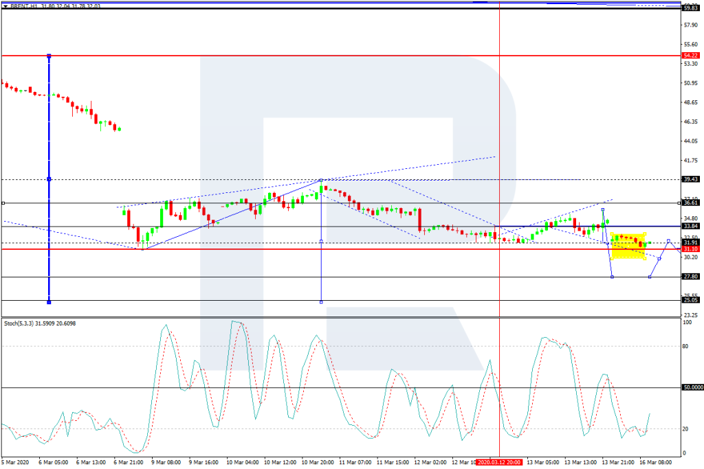 На графике H1 Brent торгуется под давлением на снижение. Рынок сегодня формирует диапазон консолидации на пробое уровня 31.90. Основным сценарием рассмотрим продолжение тренда вниз, к уровню 27.80. После этого возможен рост к 31.10. Далее ожидаем снижение до 25.05. Технически такой сценарий подтверждает и осциллятор Stochastic. Его сигнальная линия в очередной раз пробила отметку 20 вниз, что предполагает продолжение снижения цены по тренду к уровню 27.80. После этого ожидаем разворот сигнальной линии в рост к отметке 50.