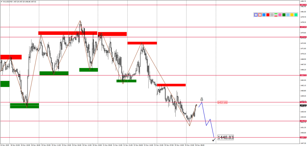 Золото на прошедшей торговой сессии, как и ожидалось, снизилось к уровню 1452, где встретило поддержку со стороны покупателей, и начало корректироваться вверх. Таким образом, на сегодня после окончания коррекции снижение цены еще может продолжиться к новому локальному минимуму. Дневное сопротивление находится на уровне 1457, которое, вероятно, будет сдерживать дальнейший рост цены. Основной сценарий предполагает тест и отбой из этой зоны, который откроет цене дорогу для снижения к уровню поддержки на 1448.